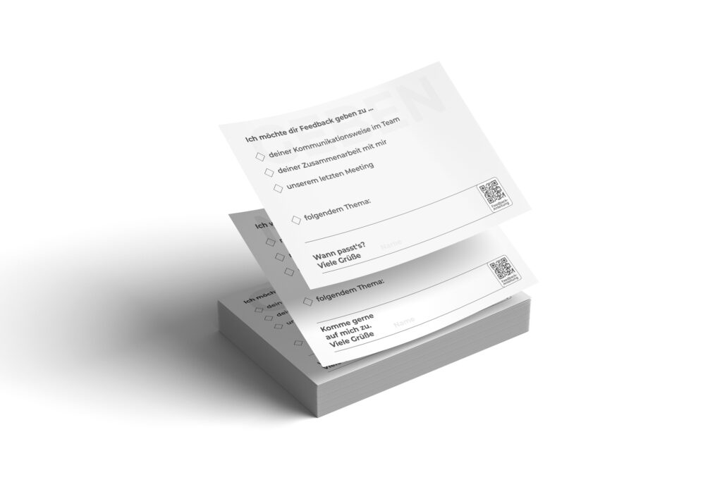 Unsere Feedback-Karten helfen dir und deinem Team, eine offene und wertschätzende Feedbackkultur im Arbeitsalltag zu etablieren. Ob Lob für herausragende Leistungen oder konstruktive Rückmeldungen – mit unseren Karten fällt es leichter, Feedback aktiv zu geben und zu empfangen. Gemeinsam schaffen wir eine Atmosphäre, in der wir uns kontinuierlich weiterentwickeln, voneinander lernen und unsere Zusammenarbeit verbessern. Lass uns den ersten Schritt zu einem stärkeren Team machen – Karte für Karte.